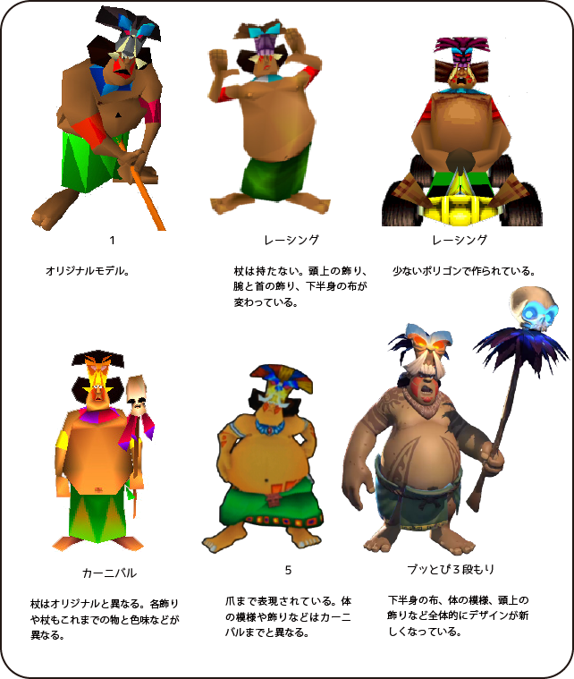 ●基本的に手下の原住民の近くにいるが「レーシング」のみ原住民は登場せず、パプパプのみの参加となっている。